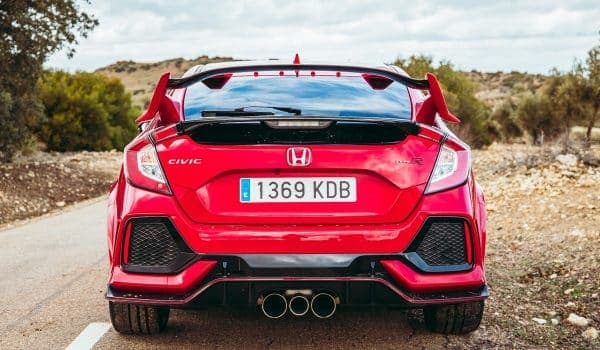 Ya en la zaga es donde encontramos algunos de los elementos más radicales y poderosos de todo su diseño, como ese enorme alerón en fibra de carbono o el triple escape que nos puede recordar a algún deportivo de la casa de Maranello. De nuevo nos encontramos con un paragolpes donde las salidas de aire son falsas, y algo más abajo un difusor en fibra de carbono que remata la zaga para deleite de aquellos a los que dejemos atrás. El rey de la parte trasera es, sin duda, el alerón, y es que el Type R no sería lo mismo sin ese drástico spoiler trasero que acapara gran parte de las miradas.