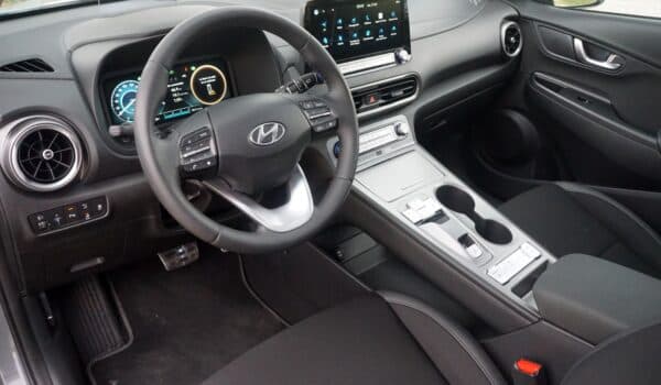 El interior del Hyundai Kona BEV es sencillo, está bien presentado y presenta todos los mandos a mano. Respecto a las versiones de gasolina cuenta con una consola inferior sobre-elevada de diseño específico que pone la nota futurista al conjunto, incluyendo aquí los botones para el control del cambio.