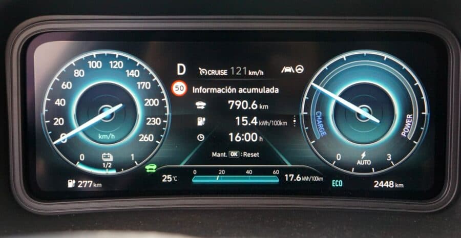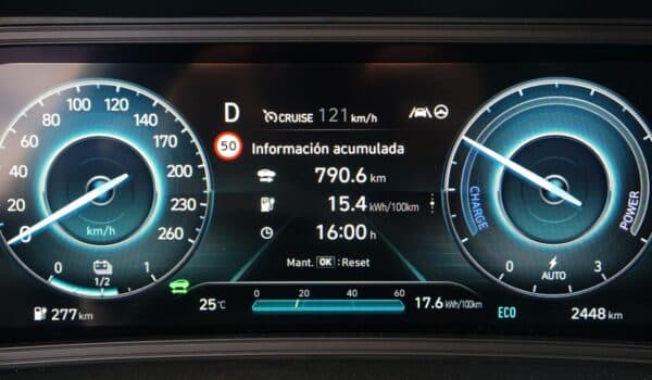 Me ha llamado la atención un pequeño detalle relativo al cargador embarcado del Hyundai Kona para cargas en corriente alterna (CA). Según la marca ahora incluyen uno con 11 kW de potencia pero en el caso de la unidad probada no fue capaz de cargar a más de 7.4 kW. En tomas súper-rápidas (corriente continua CC) acepta cargas de hasta 100 kW así que en muy pocos minutos se podrá contar con una autonomía generosa.