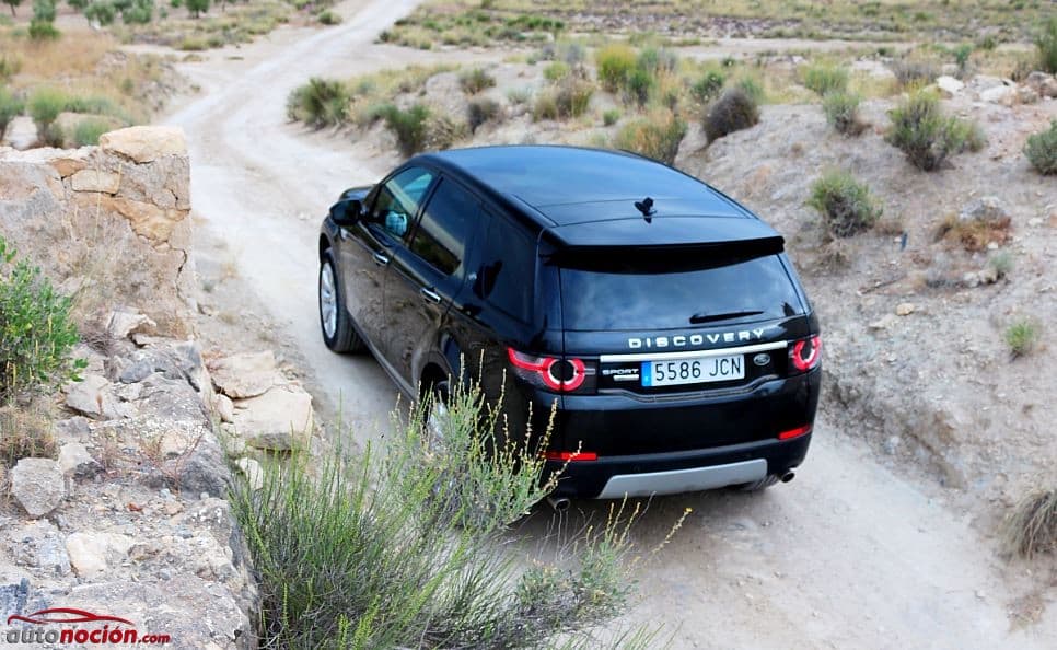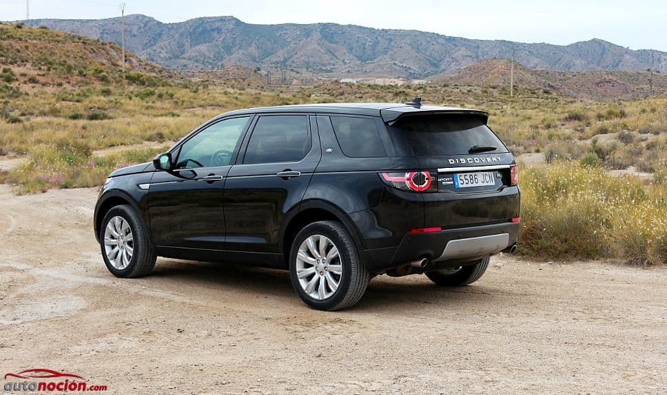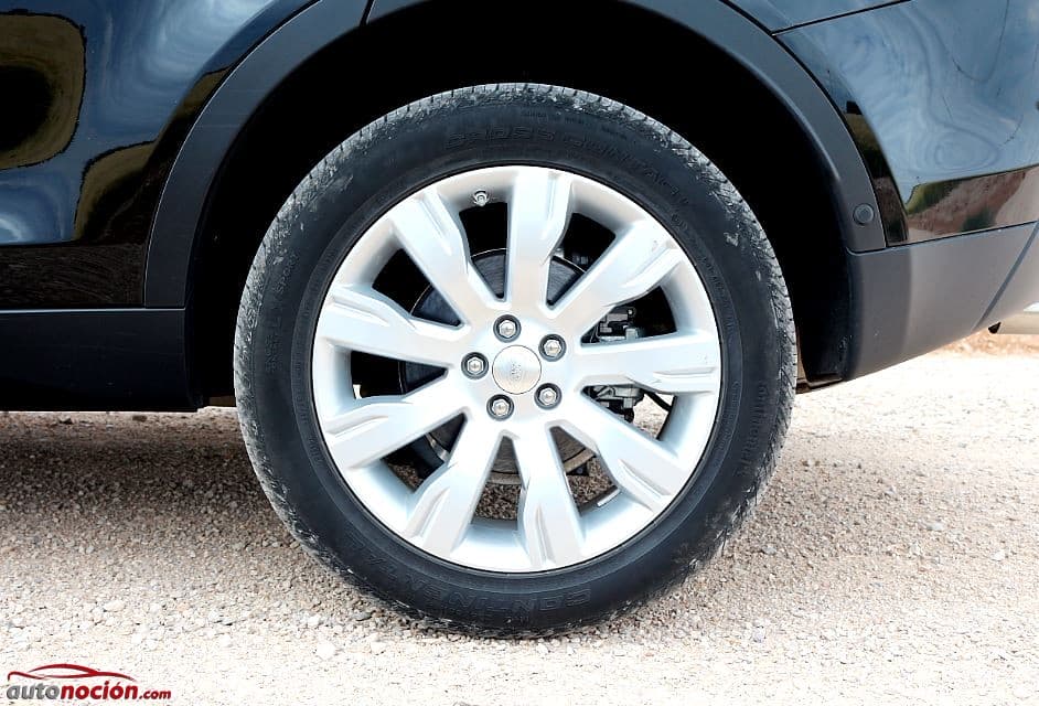 Visto de perfil, el Discovery Sport destaca por dos motivos. El primero de ellos son los abultados pasos de rueda que gracias a su visible musculatura hacen que el modelo se asiente visualmente en el terreno que pisa. Los pasos de rueda de nuestra unidad de pruebas albergaban unas llantas de aleación de 9 brazos y 19” que equipaban unos neumáticos Continental Cross Contact LX Sport en dimensiones 235/55 R19 105V M&S que sinceramente, no andaban nada mal en barro y en arena, aunque tampoco tuve la oportunidad de probarlas en profundidad. Estas ruedas ocultaban un sistema de frenos compuesto por unos discos delanteros ventilados de 325 mm y unos discos traseros macizos de 300 mm. Gracias a la importante potencia de frenado, el modelo cuenta con capacidad de sobra para parar incluso remolcando hasta 2,5 toneladas.