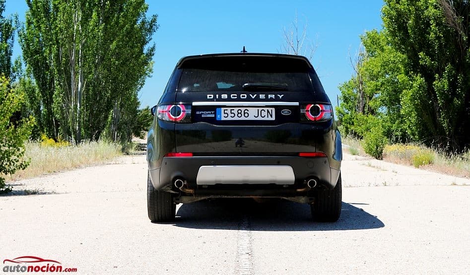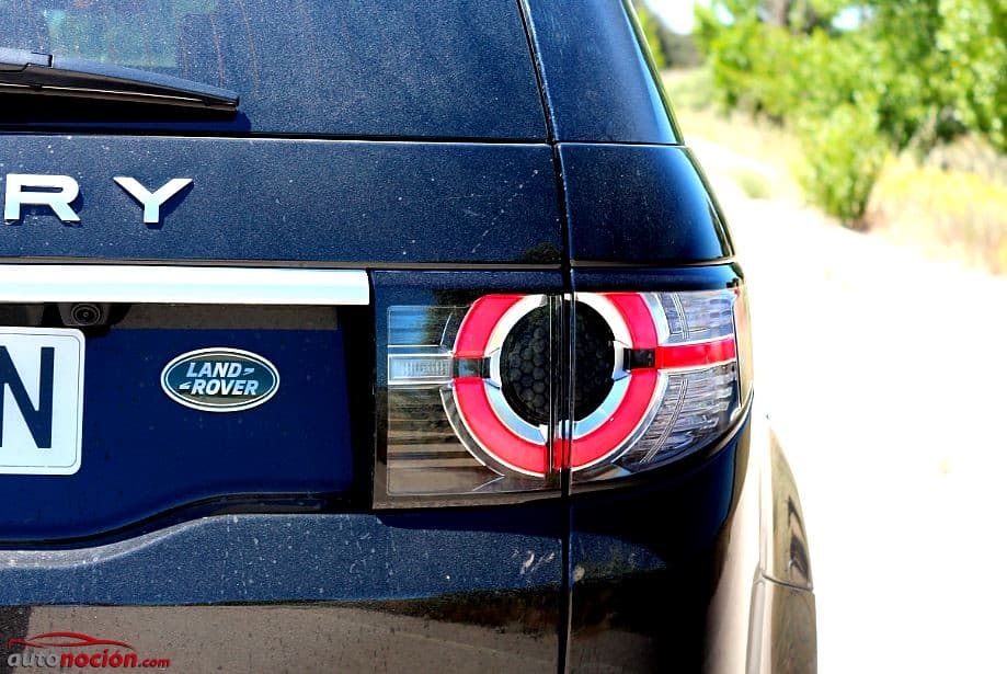 La vista trasera del modelo muestra un indiscutible ADN Land Rover. Empezando por la parte superior nos encontramos con una luna trasera rectangular que destaca por su reducida altura. La luna trasera de estas dimensiones aporta un plus de deportividad pero reduce notablemente la visibilidad trasera por lo que recomendamos encarecidamente el montaje de ayudas al estacionamiento en la parte posterior, ya sea mediante cámara o sensores (o ambos como nuestra unidad de pruebas). La luna trasera se encuentra amparada por un prominente alerón en color negro que monta la tercera luz de freno en tecnología LED.