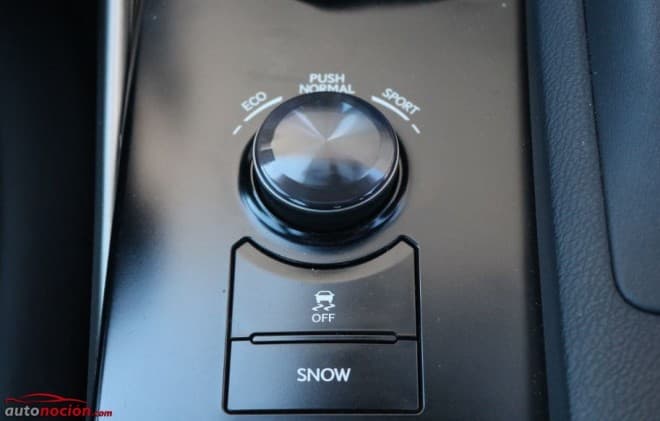 El túnel de transmisión está recubierto por una abultada prolongación de la consola central en la que se montan la palanca de cambios, el joystick de control y el sistema de selección de la modalidad de conducción. Junto al selector de modos de conducción encontraremos el botón de desconexión del control de estabilidad y un modo SNOW.