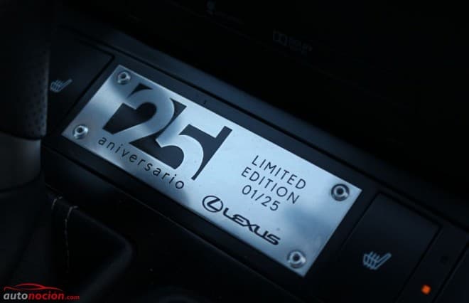 En la parte inferior de la consola central, justo frente a la palanca de cambios la marca monta una placa conmemorativa y numerada Lexus 25 Aniversario.