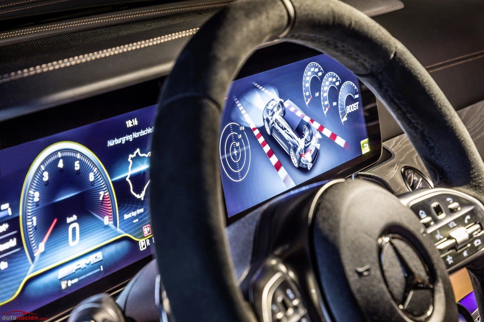 Las superficies limpias y amplias transmiten la atmósfera de un salón de lujo, pudiendo optar por un total de cinco molduras. Para la tapicería, hay hasta 11 posibilidades y en este caso encontramos el cuero napa negro con inserciones AMG en fibra de carbono -4.405€-. La iluminación ambiental dispone de 64 colores y hay varias opciones para el techo en microfibra.