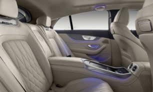 La zaga, ancha y baja, no es menos imponente que el resto de la carrocería, con dos finas y características ópticas LED con intermitentes de luces secuenciales que bordean los musculosos hombros del AMG GT 4 puertas Coupé. La tercera luz de freno en la sección superior de la luneta trasera y la sección superior redondeada de dicha luneta subrayan el carácter deportivo del coupé.