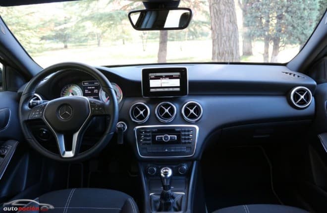 El volante de 3 radios viene con 12 botones y un bisel galvanizado. En el caso de los acabados deportivos el aro se encuentra revestido en cuero perforado y con las costuras en contraste. Curiosamente el Clase A más básico no ofrece Control de velocidad de crucero y limitador de velocidad de serie, ya que este sistema se continúa ofreciendo en el apartado de los extras. Resulta extraño que tengamos faros de xenón y llantas de aleación de serie pero no tengamos limitador o control de velocidad de crucero.