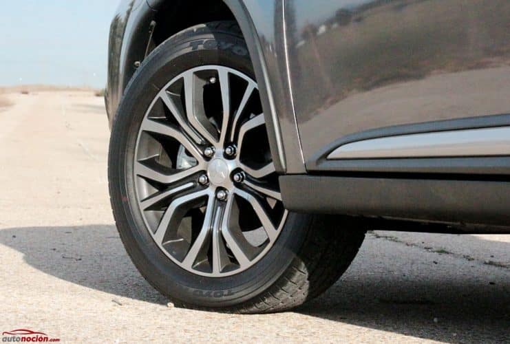 Los generosos pasos de rueda enmarcados en una superficie en color contraste que rodea la zona inferior de la carrocería albergaban unas llantas de aleación de nuevo diseño y acabado cepillado y bicolor que montaban neumáticos Toyo R37 en dimensiones 255/55 R18 98H. Sinceramente, creo que hay gomas que pueden mejorar notablemente el comportamiento del Outlander pero esta, no es una de ellas. Si te gustan las salidas al campo te recomiendo encarecidamente que busques otras cubiertas y cuando optes por un neumático de reemplazo, mejor que busques otro modelo.