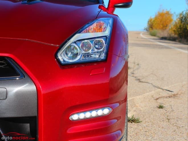En la parte superior del frontal nos topamos con unos nuevos faros rasgados desarrollados exclusivamente para el GT-R y que disponen de cuatro unidades LED que crean una luz extremadamente natural que reproduce a la luz del día. El amplio haz de luz de los faros expande el área de iluminación hacia los costados, mejorando la visibilidad, especialmente en curvas. Los faros también ajustan su patrón de iluminación dependiendo de la velocidad del vehículo, función vital para las velocidades extremadamente elevadas a las que puede llegar el GT-R.
