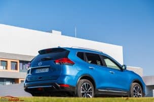 En la vista lateral, el X-Trail sigue la línea característica de los crossovers de la marca, con unos pasos de rueda prominentes y una amplia superficie acristalada cuya línea se eleva progresivamente. El lateral, al igual que la trasera, gana en personalidad propia, aunque no podemos evitar que, por ejemplo, el pilar C nos recuerde al Juke o al Qashqai, mientras que el techo cae suavemente bajo el sutil spoiler que esconde la tercera luz de freno. Por último, completan las esculpidas líneas del lateral las grandes llantas de 19 pulgadas con neumáticos Goodyear Efficientgrip en medidas 225/55 R19. Sí, no son lo mejor que podría haber para salir del asfalto, pero le dan mayor fuerza visual al conjunto.