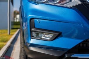 La sensación de solidez propia del X-Trail está presente en el también remozado parachoques frontal, el cual presenta unas sinuosas líneas que perfilan una parrilla inferior en la que se albergan los sensores de aparcamiento, al tiempo que esculpen los huecos donde se esconden los nuevos faros antiniebla delanteros de aspecto más estilizado que los anteriores redondeados. Como buen SUV, en la parte inferior no faltan las protecciones plásticas, rematadas también en este caso por una línea cromada horizontal a contraste.