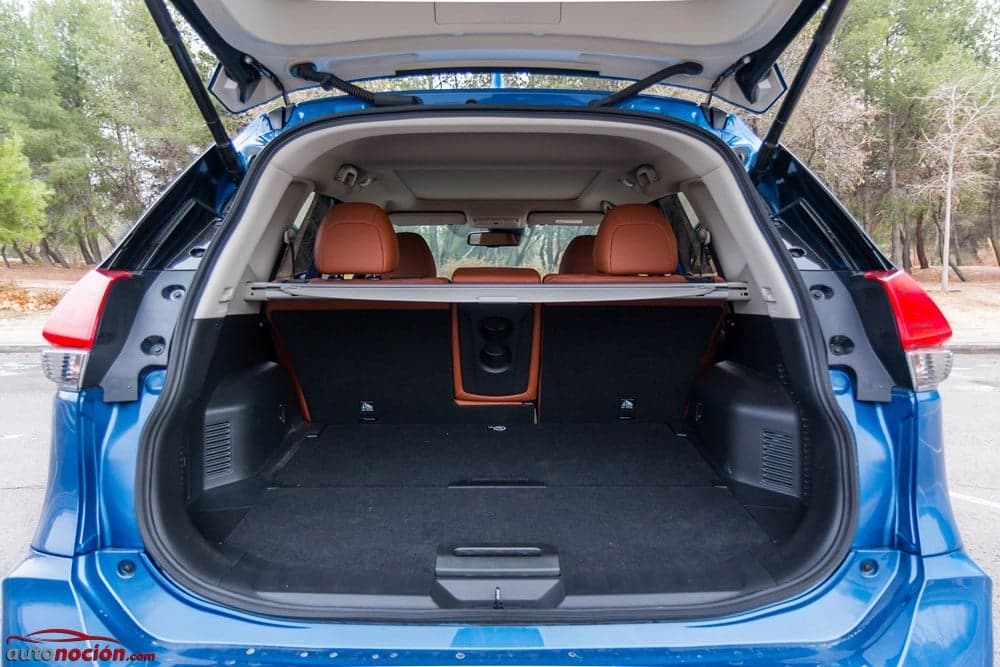En este caso contamos únicamente con cinco plazas, por lo que la capacidad de carga es de hasta 1.996 litros con los asientos abatidos -en proporción 40/20/40-. Equipado solo con cinco plazas se ganan 100 litros extra de maletero, por lo que las cotas de este varían entre los 565 y los 755 litros (en función de cómo desplacemos la segunda fila de asientos). Opcionalmente, el X-Trail puede pedirse con siete asientos, pero en ese caso cubica entre los 445 y los 640 litros al no contar con doble fondo. Con las 7 plazas montadas, la capacidad es más bien simbólica, con 135 litros. En este acabado el portón es eléctrico.