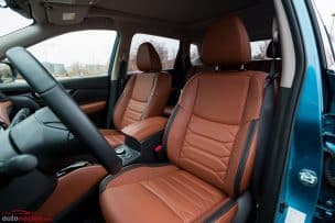 Ya en la consola central nos encontramos con un pequeño hueco portaobjetos, el freno de estacionamiento eléctrico, la palanca del cambio automático, dos posavasos y los mandos de los asientos calefactables. Respecto a los asientos delanteros, situados a ambos lados, estos presentan un acceso cómodo a pesar de la altura elevada del X-Trail y son bastante ergonómicos, sobretodo para viajar, aunque si bien es cierto estos no agarran demasiado cuando circulamos por una zona de curvas.