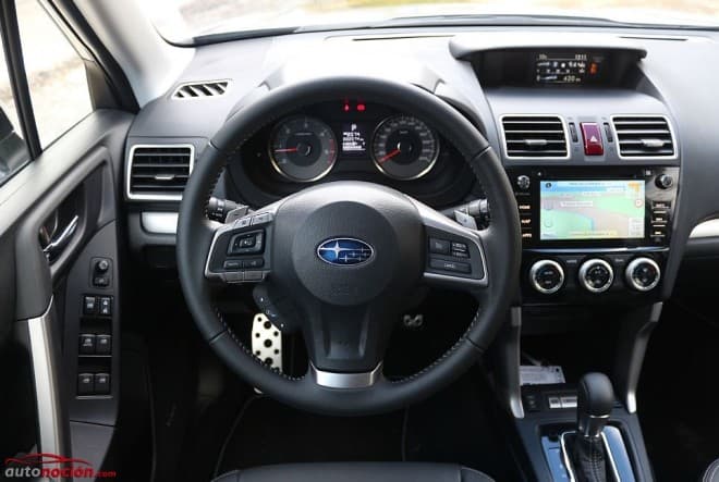 El acceso al modelo es cómodo, aspecto que se debe en parte a su altura al suelo y al ángulo de apertura de sus puertas (tanto delanteras como traseras). Una vez en el asiento del conductor nos encontramos un interior “Made in Subaru”. ¿Qué quiere decir esto?, muy sencillo, plásticos acolchados y duros que dan sensación de durabilidad.
