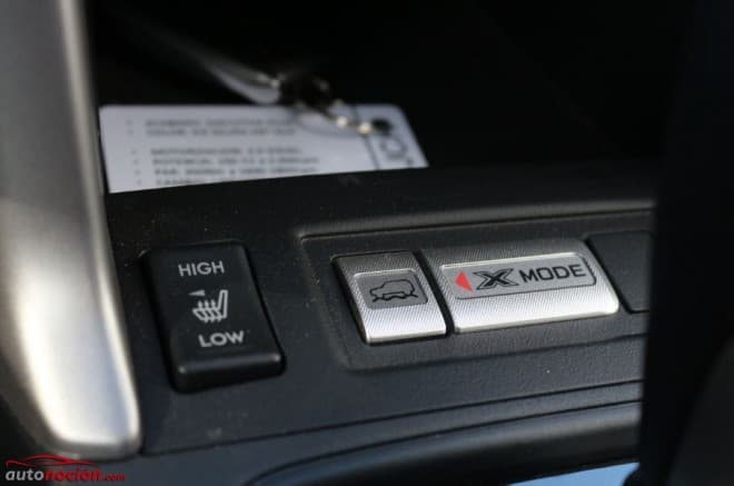 El revestimiento del túnel de transmisión encontraremos la palanca de cambios del cambio Lineartronic, los botones de los asientos calefactables, el botón del X Mode, otro espacio porta objetos y un apoyabrazos con compartimento. Tengo que comentaros que el apoyabrazos no es ajustable.