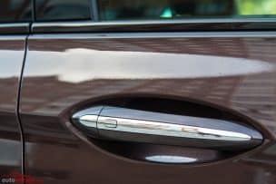La vista lateral muestra una línea ascendente que aporta un mayor dinamismo al conjunto, con unos faros delantero y trasero que invaden parte de la superficie y dos marcados nervios en la parte de las puertas que ponen de relieve la longitud del modelo. El superior se alarga hasta las ópticas posteriores y recorre los tiradores de las puertas, ambos con detalle cromado y sistema de apertura sin llave; mientras que el inferior manda la fuerza visual hacia la zaga y recalca una superficie limpia muy vistosa, pero también muy desprotegida frente a los golpes o roces. Curiosamente, los intermitentes no se encuentran en los espejos retrovisores, una tendencia bastante habitual.
