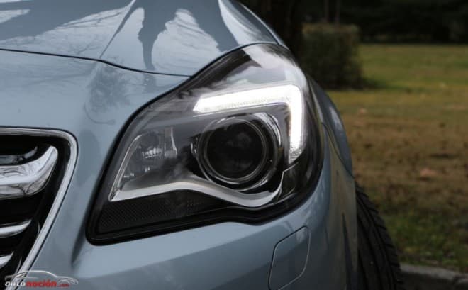 En el frontal nos encontramos con unos nuevos faros principales con luz diurna LED. En nuestra unidad contábamos con proyectores de xenón en forma de lágrima y con fondo negro. Estos faros se encuentran insertados a ambos lados de la importante parrilla cromada con cuatro lamas horizontales que portan el logo de Opel en la parte central superior.