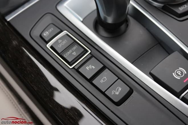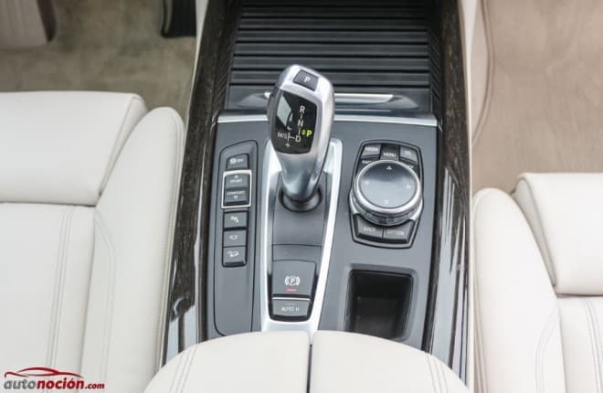 En la parte central de la consola se encuentra el botón de mando Controller del sistema de mando iDrive de serie, fácilmente accesible desde los dos asientos delanteros. A la izquierda de la palanca de cambios encontramos los comandos del Driving Experience Control, los mandos del sistema de cámaras, el botón de desactivación del control de tracción, el control de descenso o el freno de mano eléctrico.