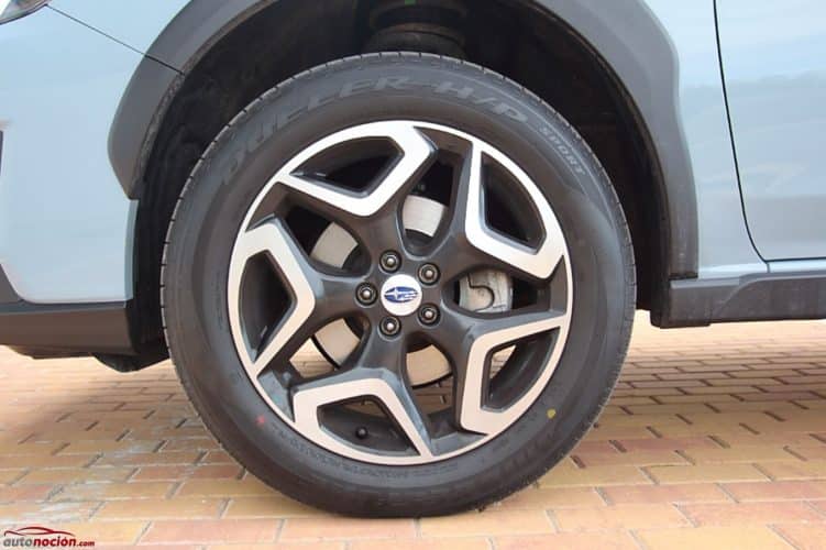 En el lateral destacan las protecciones en color contraste que enmarcan los pasos de rueda y subrayan la parte inferior de las puertas a modo de faldones laterales. Los abultados pasos de ruedas albergan llantas de 17 o 18 pulgadas en función del acabado. En nuestra unidad de pruebas contábamos con unas llantas de aleación en doble color de 18″ que equipaban unos neumáticos Bridgestone Dueler H/P en dimensiones 225/55 R18 98V. He de confesar que a pesar de haber perdido los neumáticos M&S de serie con los que venía equipada la anterior generación del Subaru XV, el comportamiento general del modelo con estas gomas es realmente satisfactorio gracias en parte al sistema de tracción AWD simétrico.