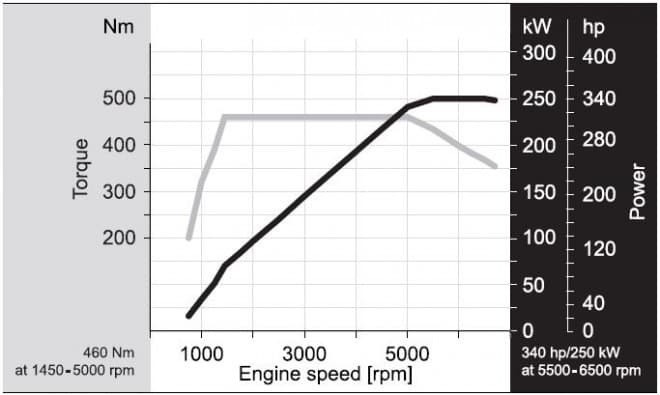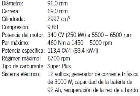 Esta motor V6 de tres litros de cilindrada cuenta con 340 cv (250 kW) disponibles entre las 5.500 y 6.500 rpm así como un par motor de 460 Nm entre las 1.450 y las 5.000 rpm alimentados por un depósito de gasolina 98 con 65 litros de capacidad.