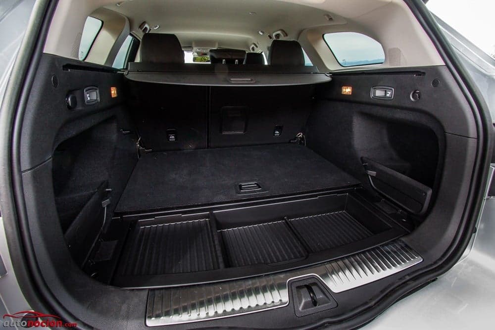 El portón cuenta con unas dimensiones soberbias y podemos equiparlo con acceso manos libres por 550 euros. Esto permite que, cuando llegas a tu coche con las manos ocupadas, puedas abrir el maletero con un simple movimiento de pie bajo el parachoques trasero. Donde acaba el portón encontramos los sensores de aparcamiento traseros y comienza el paragolpes, escoltado en sus extremos por dos catadióptricos. En él se ubica también un difusor plástico en el que podemos ver las dos salidas de escape cromadas y otros dos sensores de aparcamiento.