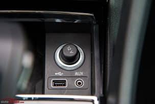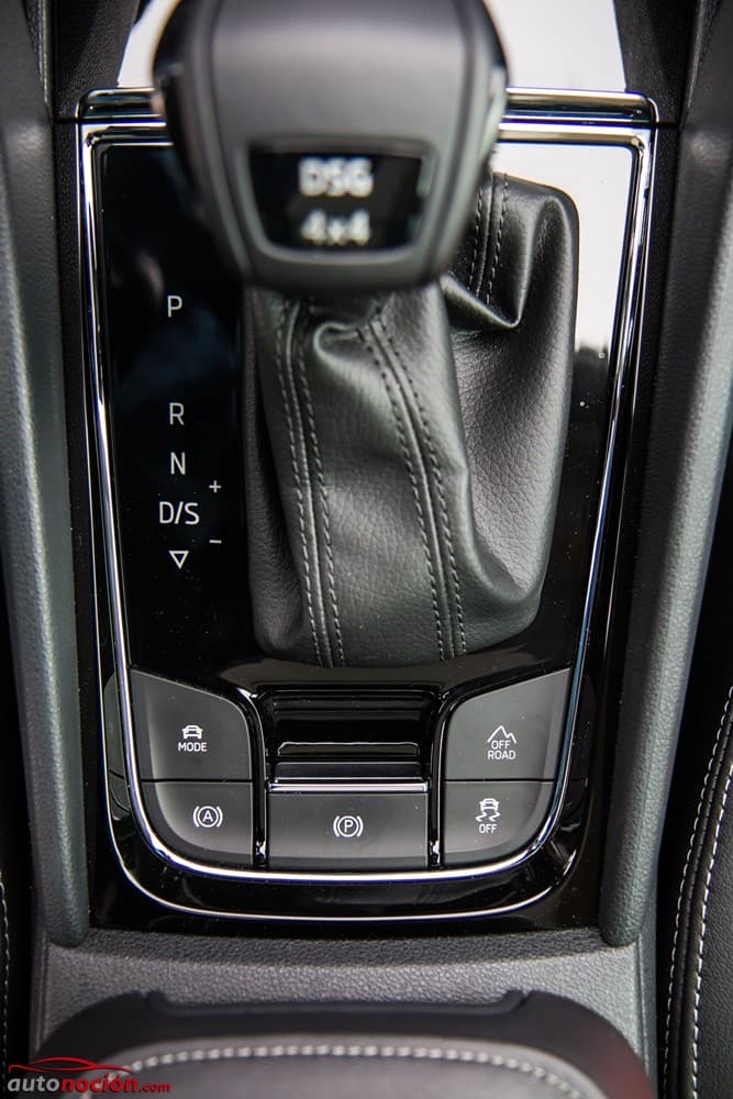 A continuación, nos topamos con la extensión de la consola que empieza a curvarse en la tapa de un hueco portaobjetos ubicado frente a la palanca de cambios de la transmisión automática DSG de siete velocidades. En este hueco encontramos una superficie gomosa antideslizante ideal para guardar pequeños objetos además de la tomas USB y Aux del equipo de sonido. La bandeja es tan amplia que incluso puede depositarse en ella un smartphone. La parte posterior de la palanca de cambios cuenta con algunos botones y el pulsador del freno de mano eléctrico. Entre ellos encontramos el modo off road, la activación y desactivación del sistema Start/Stop y el selector de modos (MODE).