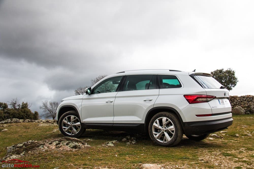 En la vista lateral el Kodiaq sigue haciendo gala de una fuerte presencia con tintes SUV, destacando elementos como los raíles cromados de techo, una gran superficie acristalada con las lunas posteriores tintadas y un nervio superior bajo la misma que va desde el capó hasta la zaga uniendo la apertura del mismo con los pilotos traseros. Con ello, el lateral luce un diseño más bien cuadrado que da el toque robusto y dinámico al conjunto, el cual se muestra carente de distracciones o adornos en esta versión.