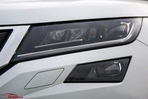 En el paragolpes delantero el Kodiaq cuenta con una entrada de aire inferior divida en dos alturas. La parte superior es la más extensa y cuenta con un diseño de nido de abeja, mientras que la inferior se integra en las protecciones plásticas que bordean la carrocería de este SUV para darle un toque campero al conjunto. Al mismo tiempo, en el capó es protagonista un gran nervio que transcurre desde la luna delantera hasta el logo, localizado en posición central sobre la parrilla. En la misma encontramos también el radar y los sensores.