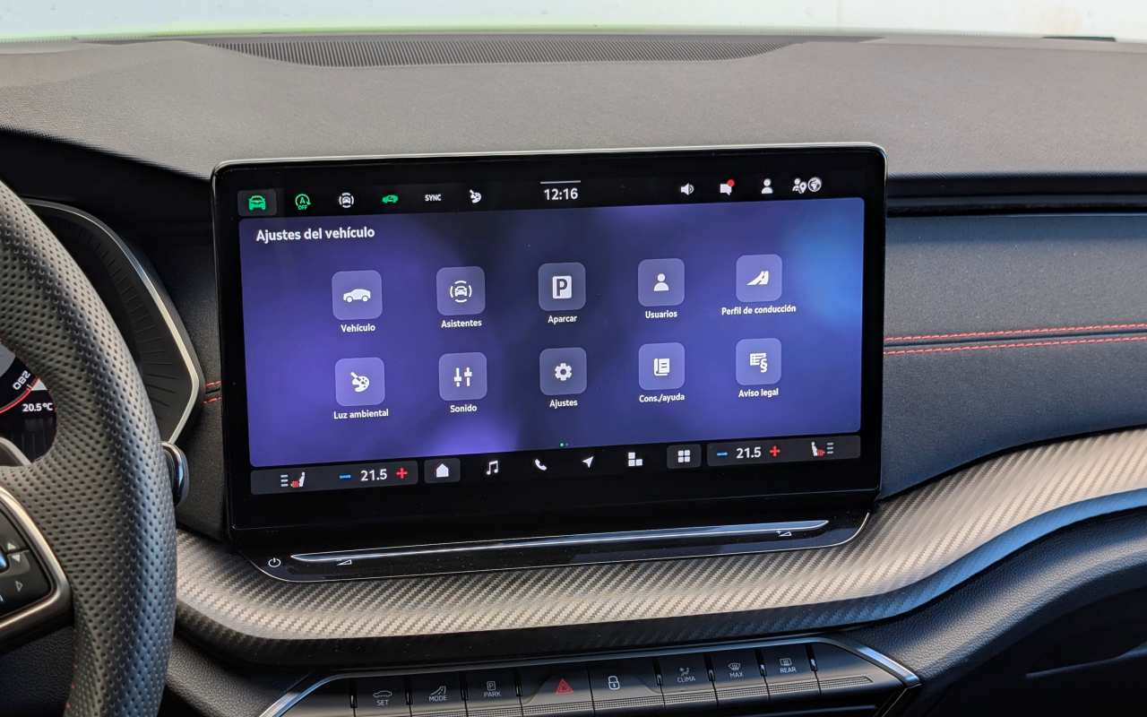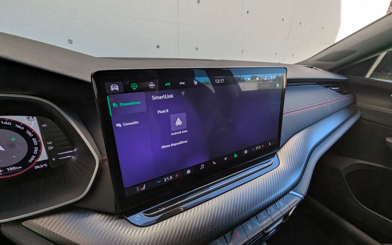 La pantalla táctil, de 13 pulgadas, concentra casi todas las funciones del vehículo. Su nuevo hardware y software mejoran notablemente la experiencia: ofrece actualizaciones inalámbricas, sensores de proximidad, menús configurables y un sistema de control por voz más avanzado. Además, incorpora la integración de ChatGPT, que se irá ampliando con futuras actualizaciones. Es compatible de serie con Android Auto y Apple CarPlay inalámbricos, y destaca por la rapidez de respuesta, la fluidez del sistema y la calidad visual de sus gráficos.