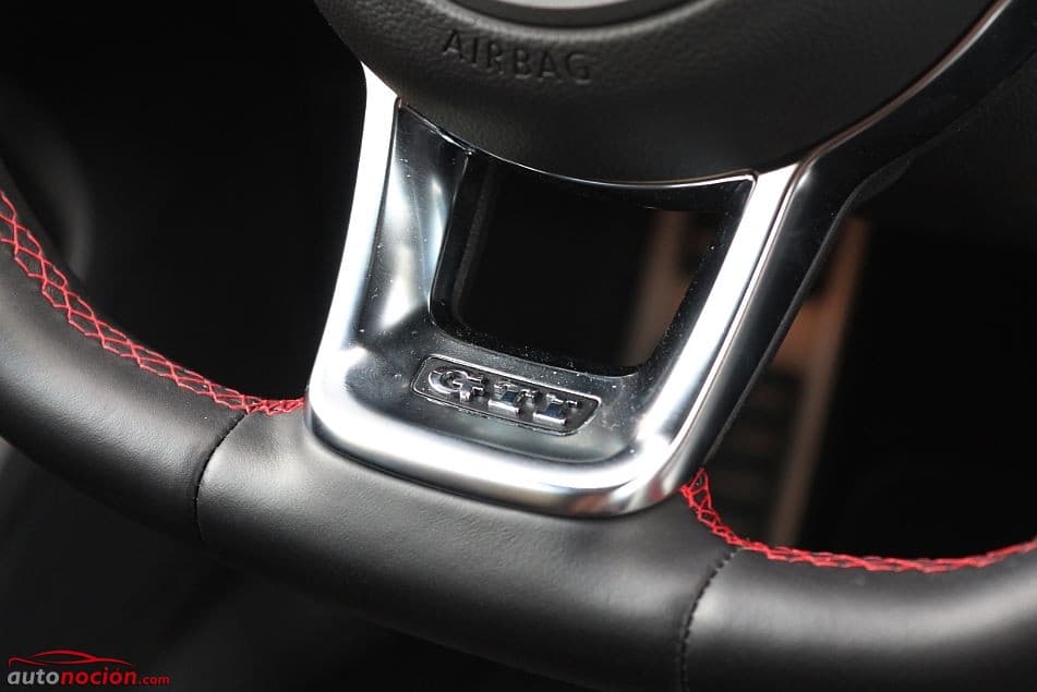 El nuevo volante multifunción con logo GTI, rompe con lo que conocíamos hasta la fecha en VW y presenta una disposición en la botonera mucho más intuitiva. El volante está forrado en cuero con pespuntes en rojo.