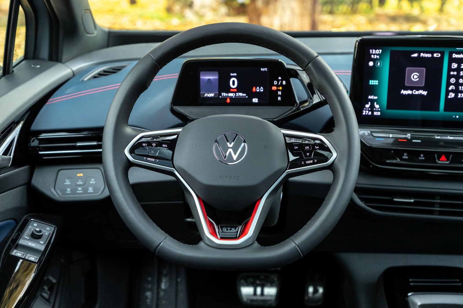 El ID.5 GTX cuenta con un interior muy moderno. En él encontramos multitud de instrumentos digitales, lo que compone un auténtico «Digital Cockpit». Destacan especialmente el volante multifunción con botones táctiles, la instrumentación digital y un sistema de infotainment de generosas dimensiones con conexión online de serie.
