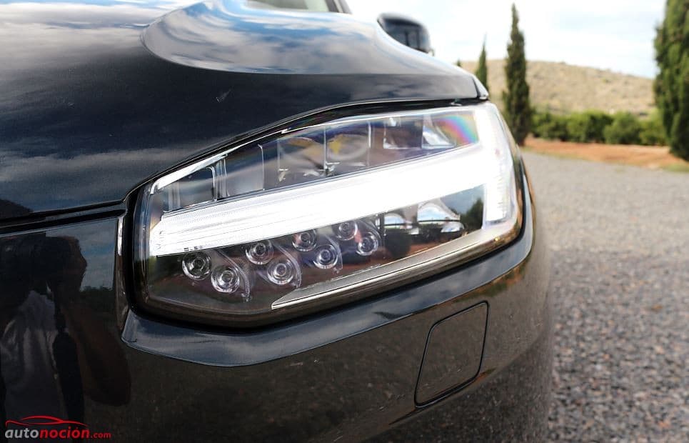 A ambos lados de la generosa parrilla nos encontramos con uno de los elementos más expresivos el nuevo Volvo XC90, nos referimos a sus tecnológicos faros activos tipo LED. El sistema genera un haz luminoso sumamente amplio y largo y es una pasada en la noche. El alumbrado es más del doble de intenso que las luces halógenas convencionales y para ayudarnos a ver mejor hacia los lados por la noche, las luces giran hasta 30 grados en cualquier dirección con los movimientos del volante. Gracias al nuevo sistema, se puede dejar la luz larga conectada en todo momento ya que cuando otro vehículo se aproxima en dirección opuesta, el sistema evita que el otro conductor se deslumbre sombreando tan sólo la parte necesaria de luz, ni más ni menos. Los faros LED alumbrarán las zonas alrededor de otros vehículos con las luces largas. La elevada posición de la cámara encargada de detectar otras luces en la calzada es la responsable de que el sistema funcione tan bien.