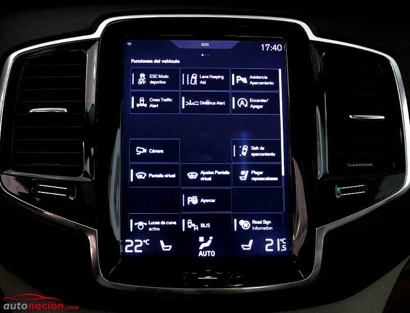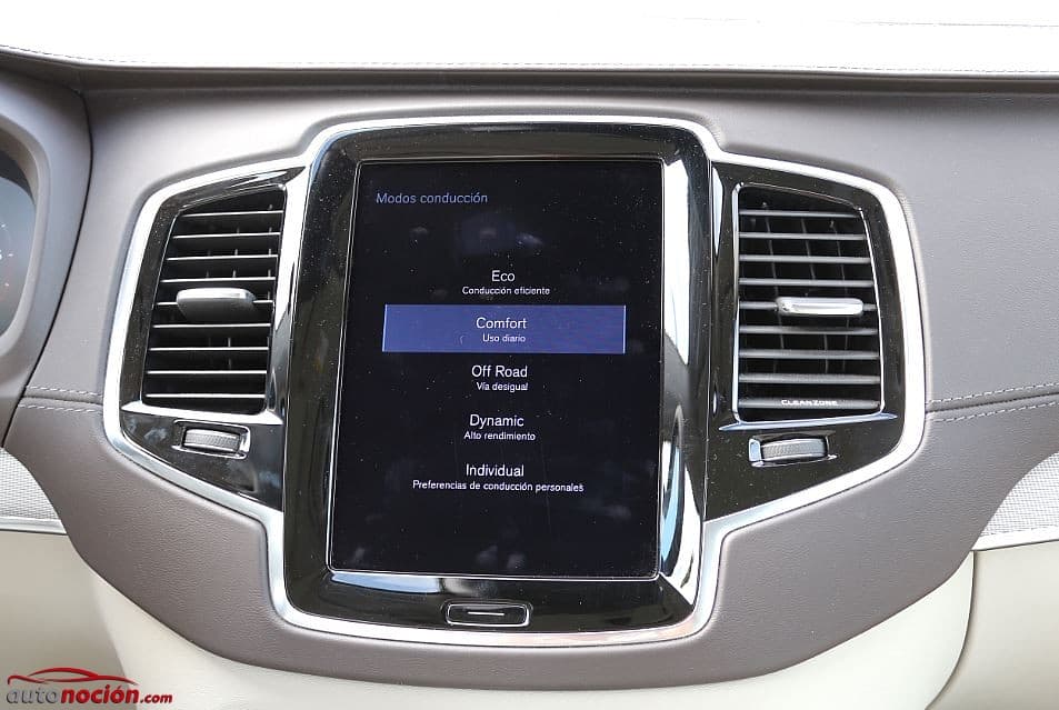 Uno de los puntos fuertes del interior del nuevo Volvo XC90 es la consola central que ha sido sabiamente reducida y aglutinada en funciones a una pantalla de 9 pulgadas. Así es, en la consola central ahora sólo hay 8 botones y como no, un completo interfaz en la pantalla. Estudiado de principio a fin, este sistema ofrece un uso sencillo, una interfaz muy clara y como no, todas y cada una de las opciones de las que dispone el conductor en un coche convencional y muchas más a un simple toque de pantalla. Estamos hablando de un sistema muy refinado y lo cierto es que la dimensión de la pantalla, pese a parecer grande al principio, se queda pequeña conforme nos hacemos a su interfaz. Sin lugar a dudas estamos hablando de una magnífica integración que además reúne todos los sistemas en uno. Lo cierto es que la única pega que le puedo poner a este magnífico sistema Sensus es la superficie de la pantalla que carece de un tratamiento oleofóbico a la altura. Así es, creo que la toallita de limpieza que encontraremos en la guantera no es suficiente ya que actualmente contamos con dispositivos en el mercado con pantallas semejantes que no se ensucian tanto ni con tanta facilidad.