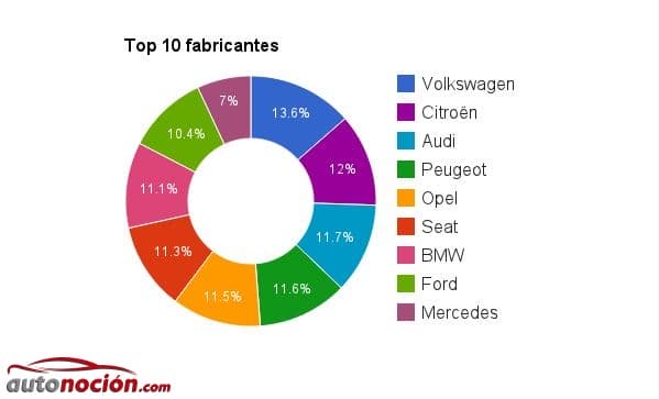 En el ranking de fabricantes, no es sorpresa que Alemania y Francia se repartan un buen trozo del pastel. Volkswagen es la gran ganadora, copando un 13.6% de las ventas entre las diez primeras marcas. Francia ocupa el segundo (Citroën) y cuarto puesto (Peugeot), mientras que la española Seat entra en el top 10, por delante de pesos pesados como los coches de segunda mano de BMW, Ford y Mercedes.