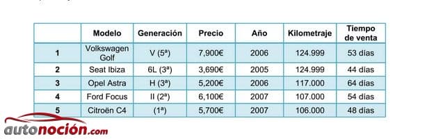 Los datos de la tabla reflejan los anuncios de coches de segunda mano listados en AutoUncle.es que han sido borrados por el anunciante desde el 1 de enero hasta el 31 diciembre de 2014; la mayoría de las veces que se borra un anuncio se debe a que el coche ha sido vendido, pero los porcentajes deben tomarse como un número orientativo y no absoluto. El ránking de modelos se ha obtenido de la suma de todas las generaciones de cada modelo, mientras que los datos de precio, año, kilometraje y tiempo de venta son aquellos de la generación más popular de cada modelo y se han calculado sobre la mediana del total.