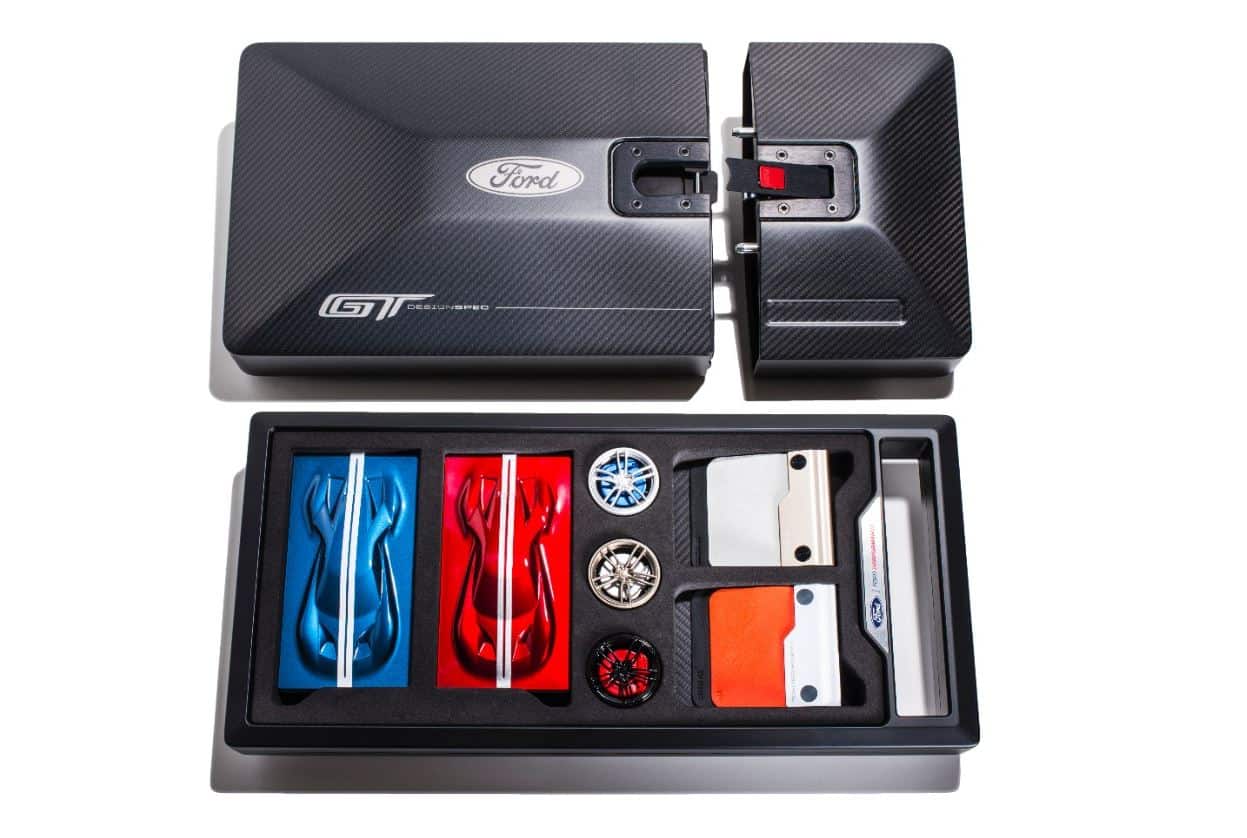 Los clientes a quienes se haya aprobado su pedido de Ford GT recibirán un kit que les permite configurar físicamente cada aspecto de su nuevo supercoche, desde el color de pintura exterior a las opciones de llantas, el color de las pinzas, muestras de los materiales interiores o las franjas de competición, vamos, lo que viene siendo un configurador totalmente realista para que el cliente pueda tocar y ver cada uno de los detalles configurables con los que cuenta el modelo.