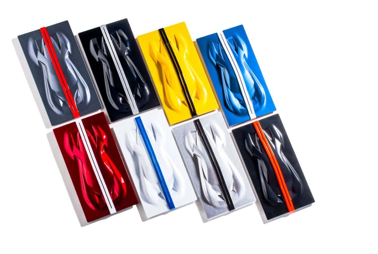 Cada kit de pedido cuenta con ocho muestras de color exterior con franjas intercambiables que muestran las múltiples opciones disponibles. Cuenta con réplicas de llantas a escala, con pinzas de distintos colores entre las opciones para el exterior.