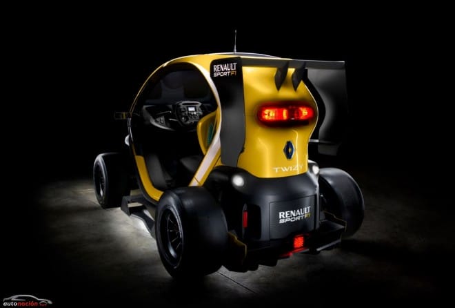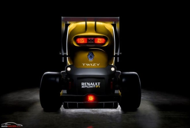 Twizy Renault Sport F1 muestra un extraño parentesco con la disciplina reina del deporte del automóvil: neumáticos slick de monoplaza, lámina delantera, pontones laterales, alerón trasero de carbono y un difusor que incorpora una luz de lluvia que se activa cuando el KERS entra en acción.