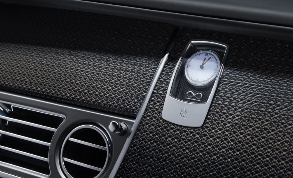 En el cuadro de mandos del coche, va incrustado un reloj Black Badge con manecillas de punta naranja y esfera adornada por el logotipo de la clase «Sin límites» que ya lució el celebrado Phantom Drophead Waterspeed.