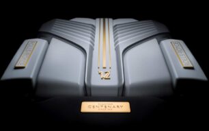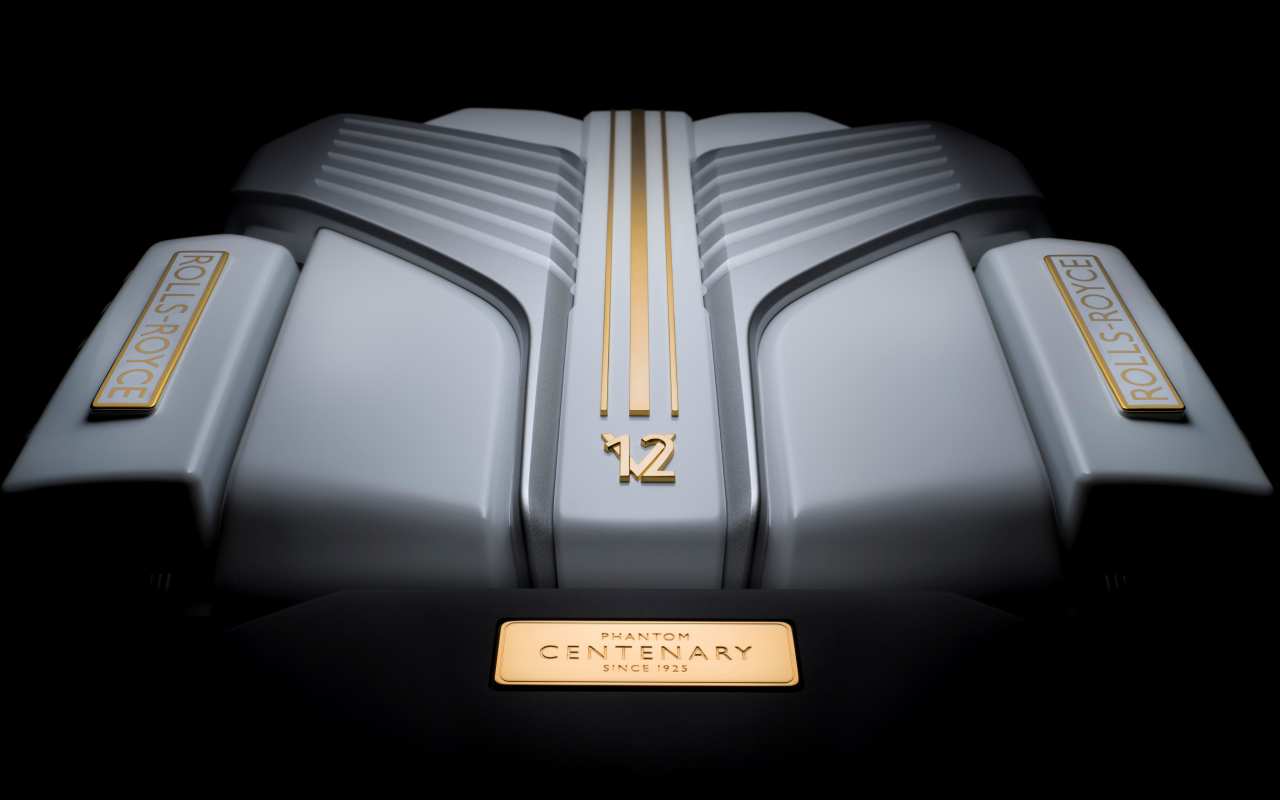 El legendario motor V12 de 6.75 litros recibe una cubierta especial en Arctic White con detalles en oro de 24 quilates, celebrando un siglo de potencia y elegancia mecánica.
