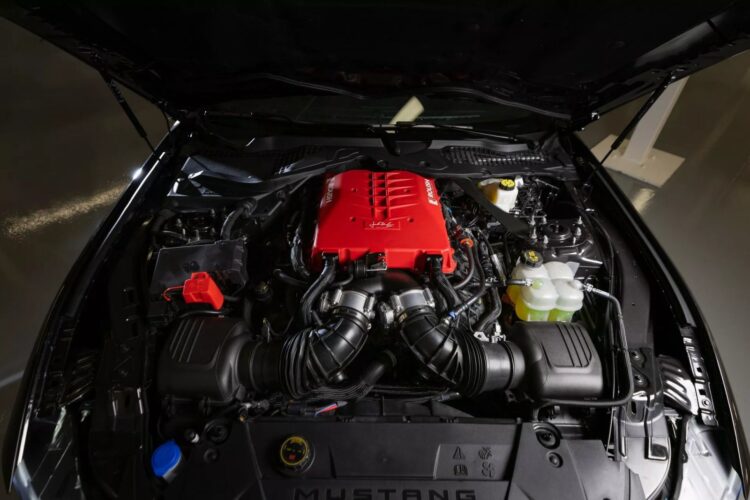 Para rematar, encontramos»inyectores de combustible de cono doble con placas directoras optimizadas, entre otros cambios menores. El resultado son nada menos que 335 CV (264 kW) de potencia y 264 Nm de par máximo adicionales con respecto a la variante americana del pony car. En definitiva, eroga la friolera de 821 CV (604 kW) y 853 Nm de par motor.