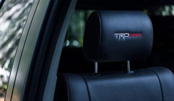 – En el interior, los asientos tapizados en cuero negro TRD Pro con costuras en contraste rojo y el logo «TRD Pro» cosido en los reposacabezas delanteros son cómodos y duraderos.