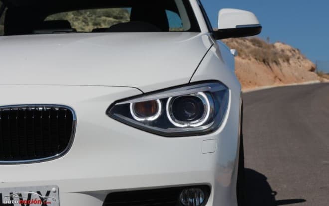 Visto de lado, el BMW Serie 1 destaca por su largo capó, por su carrocería desplazada hacia atrás y por sus abultados pasos de rueda. Nuestra unidad montaba un paquete de iluminación con el que se incorporaba iluminación LED en los tiradores de las puertas.