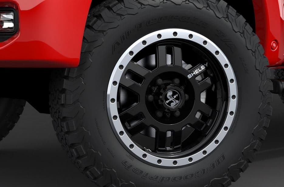 Entre las novedades estéticas nos encontramos con los nuevos logos, la nueva parrilla y las nuevas llantas personalizadas Shelby de 18 pulgadas. Estas llantas montan unos neumáticos de BFGoodrich All-Terrain KO2. Para mejorar el comportamiento, el equipo encargado de esta preparación optó por un sistema de suspensión de alto rendimiento diseñado a medida fabricado por Shelby compuesto por amortiguadores Fox y BDS que pueden ser ajustados para cada uno de los terrenos y para cada una de las formas de conducción.