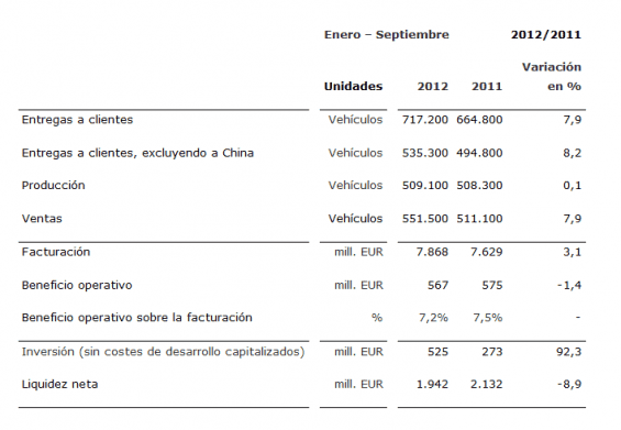 Las inversiones en nuevos modelos y en la ampliación de la capacidad de producción, requisito previo para la ofensiva de modelos, aumentaron hasta los 525 millones de euros entre enero y septiembre de 2012. La liquidez neta a 30 de septiembre superó los 1.900 millones de euros.