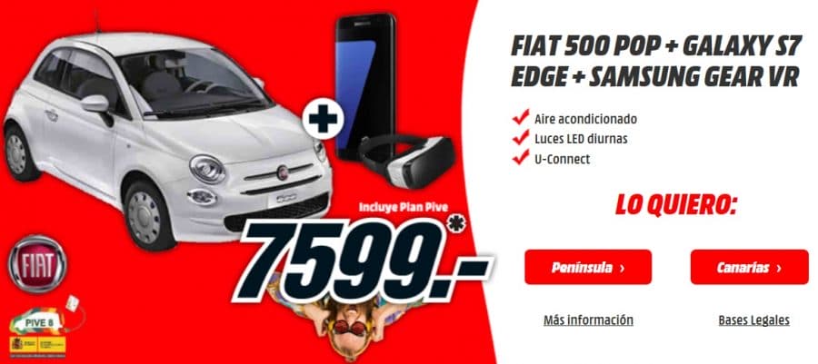 ¿Qué es lo interesante? Pues sencillo. En unas condiciones muy parecidas, con PIVE, el precio habitual del Fiat 500 Pop 1.2i 69 CV es de 8.700 € por lo que con la promoción especial te ahorras 1.101 € concretamente. Además por la compra del coche se regala un Samsung Galaxy S7 Edge y unas gafas Samsung Gear VR por lo que el descuento puede decirse es todavía mayor.
