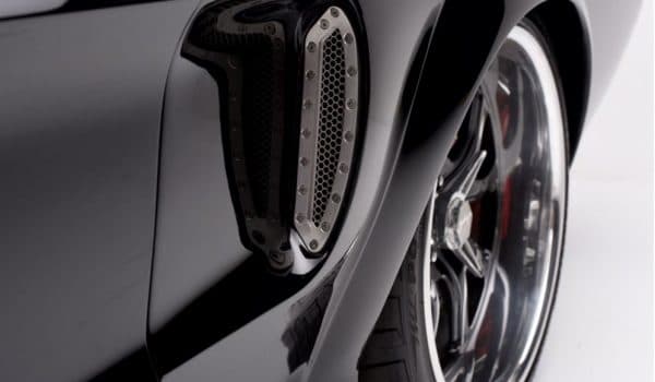 La carrocería ampliamente modificada con elementos como los faros de un Mustang de 2005, la entrada de refrigeración, faldones laterales personalizados, guardabarros traseros ensanchados y un enorme difusor.