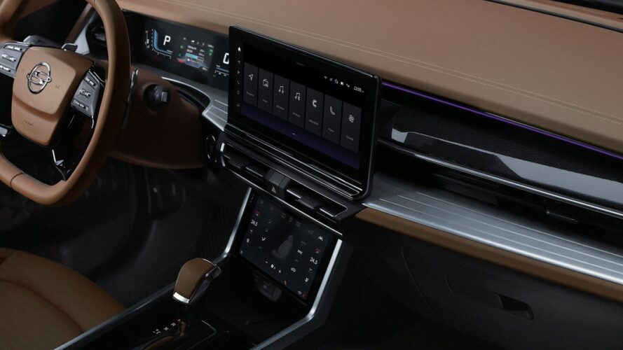 En el interior destaca la digitalización y un extraño volante. La pantalla táctil de información y entretenimiento central de 12.3 pulgadas y otro panel táctil de 8 pulgadas para los controles de clima dan un toque muy premium. El volante de cuatro radios de fondo plano tiene muchos botones integrados, mientras que el tablero, las puertas y la consola central cuentan con detalles metálicos que contrastan con la tapicería de cuero.