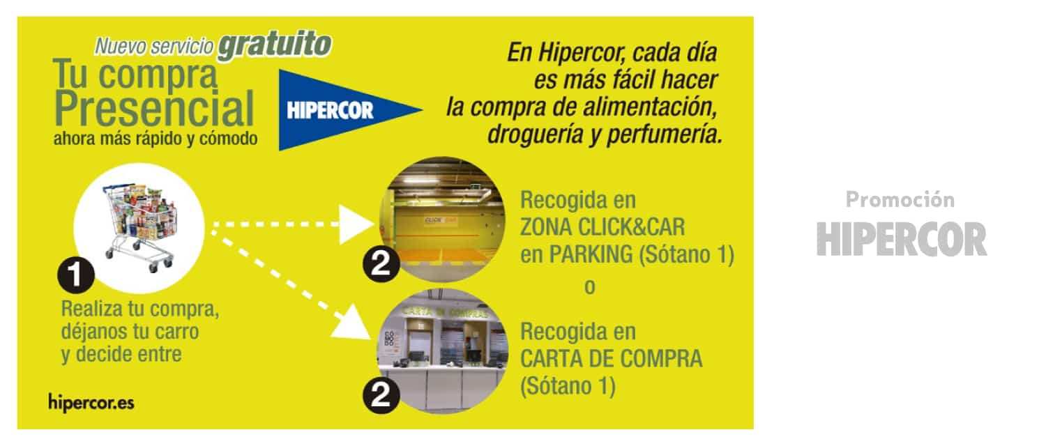 | Hipercor | Click&Car | Más de dos horas | 30€ | Gratuito | Todos los de España | Consigna o aparcamiento |