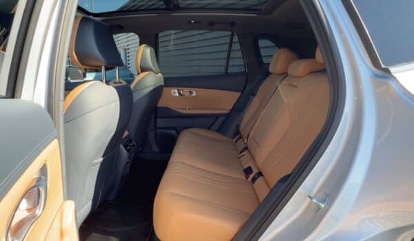 Esta unidad cuenta con el máximo equipamiento, entre otros: los asientos eléctricos, calefactables, ventilados, con masaje y función memoria, cámaras de aparcamiento 360º y el equipo de música FlyMe con 16 altavoces. Como en el Geely E5, la amplitud es uno de sus puntos fuertes. Hay mucho espacio libre para la cabeza, incluso para personas que midan más de 2 metros de alto mientras que los asientos parecen muy confortables.