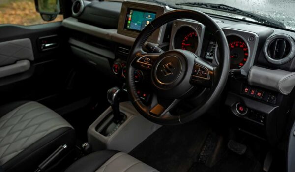 La conversión fue de todo menos sencilla: el chasis se alargó, se instaló un tercer eje con piezas originales de Suzuki, se ampliaron los pasos de rueda y se construyó una nueva caja trasera. Todo esto, bañado en el sofisticado Nardo Grey de Audi y con un interior rediseñado en cuero acolchado negro y gris.